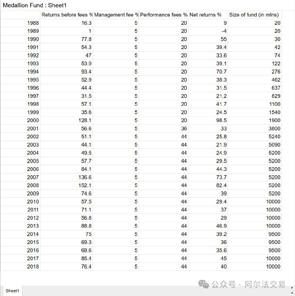 在格雷戈里·祖克曼(Gregory Zuckerman)的《解码市场之人》(The Man Who Solved The Market)的附录1中,祖克曼贴心地整理了大奖章基金的业绩和年度回报:
