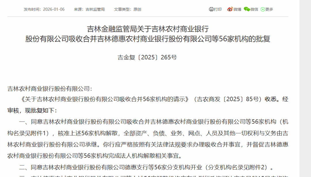 2026-01-07南宫28官网,南宫28官方网站,南宫28APP下载1月6日,吉林金融监管局批复公告称,同意吉林农村商业银行股份有限公司(以下简称吉林农商银行)吸收省内8家农商银行及48家村镇银行,核准上述56家机构解散。