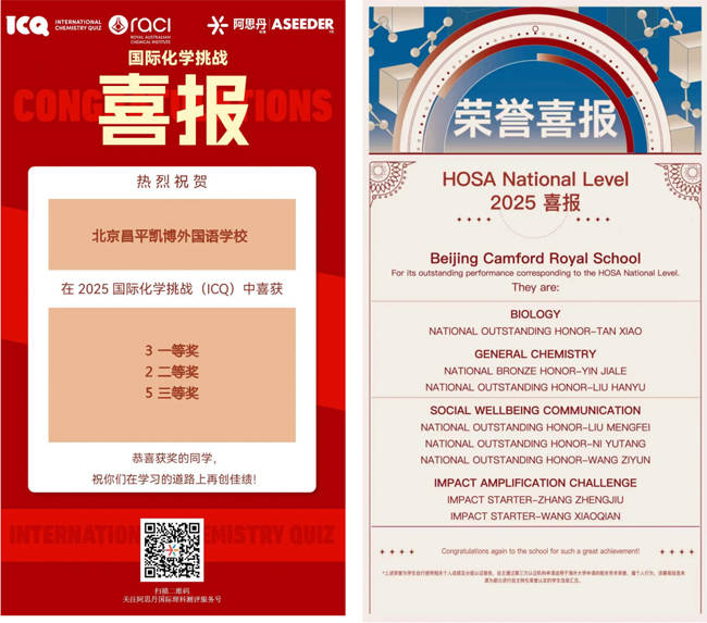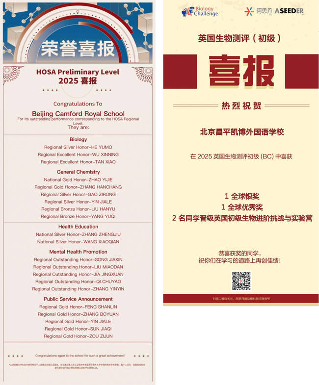 在HOSA初阶站中,初中部学生们赢得1枚全国金奖2枚全国银奖,6枚区域金奖5枚区域银奖;在HOSA中国站中,赢得1枚全国铜奖5枚全国杰出奖;在英国生物测评中,赢得1枚全球银奖;在国际化学挑战中,赢得3枚全国一等奖2枚全国二等奖。