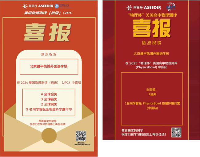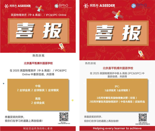 2024-2025学年,凯博初中部的学生们不惧世界舞台的挑战,在与全球学子的比拼中展现强项优势:在英国物理测评初级中荣获4枚全球金奖3枚全球银奖,中级测评中荣获2枚全球金奖,3枚全球银奖,高级测评中荣获2枚全球金奖;在“物理杯”美国高中物理测评中荣获1枚全国金奖。
