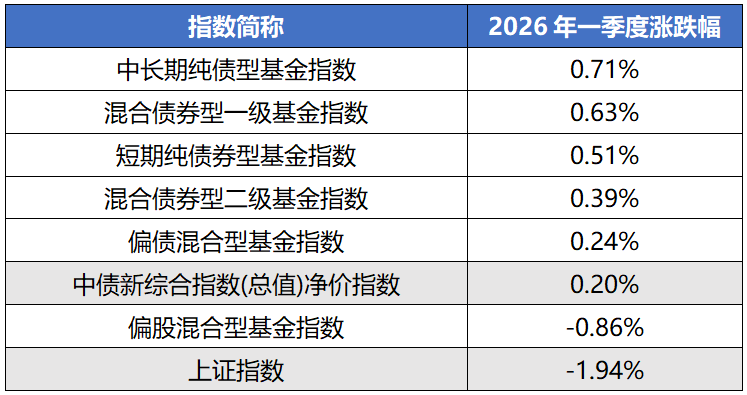 以基金指数一季度表现观察,短债、中长债、包括混债类基金指数一季度取得正收益。当市场从“高歌猛进”切换到“反复拉扯”,对确定性的追求正在重新占据上风。震荡市下,或许降低组合的整体波动,本身就是一种有意义的配置目标。