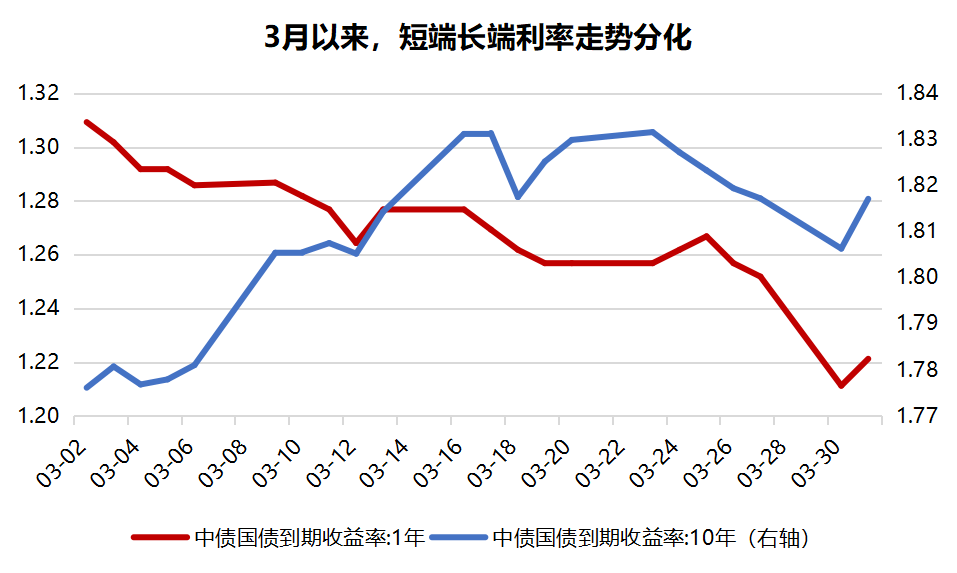 聚焦纯债本身,3月以来短端利率继续下行、长端震荡上行,走势分化。主要由于中短端确定性更强,无论是前述的资金再配置逻辑,或是持续的宽货币环境,都对短端构成支撑。
