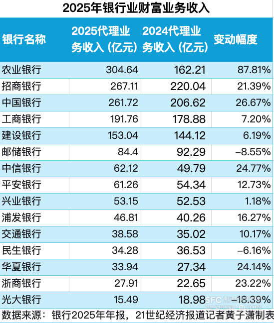 据统计,六大国有银行和九家上市股份行共计15家银行中,有12家在2025年实现了财富业务的正增长。15家银行的代理业务收入合计超过1600亿元,平均增幅达21%。